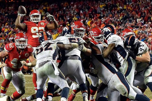 Помимо пасового тачдауна Деза Брайанта был и еще один похожий розыгрыш, заслуживающий внимания. В концовке матча против «Денвера» тренер «Канзас-Сити» Энди Рид велел выйти на поле защитнику Донтари По. «Чифс» стояли у зачетной зоны соперника, и все ждали, что крепыш По возьмет мяч в руки и попробует протолкать себе путь в зачетную зону. Но получилось все куда изящнее.