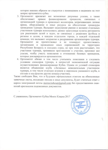 Однако организаторы Кубка приняли решение не допустить игроков «Литвинов» до матчей по причине «факта саботирования идеи проведения турнира» со стороны клуба «Литвины», а также «открытого оскорбления будущих участников Кубка Монте Кларка». Оргкомитет посчитал, что «рвение и желание отдельных участников турнира использовать двояко трактуемые пункты регламента для целей и задач, не связанных с развитием футбола […] вызывают неприятие и раздражение организаторов турнира». Кроме того, «одним из условий спонсоров является объявление клуба „Литвины“ нежелательным участником турнира […] в составе и под флагом других команд-участниц». Оргкомитет, тем не менее, отдельно подчеркнул, что «не препятствовал и не планирует препятствовать организации и проведению иных соревнований на территории Республики Беларусь и соседних стран, но при этом рассчитывает, что участники турнира, принявшие приглашение к участию, приложат все усилия, чтобы учесть пожелания в отношении базовых принципов, которые декларируются оргкомитетом».