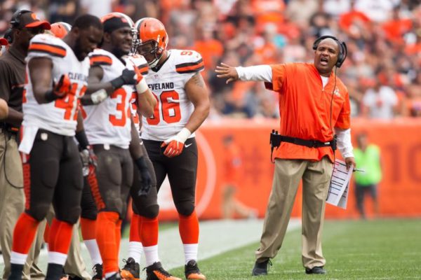 Sep 18, 2016; Cleveland, OH, USA; Cleveland Browns head coach Hue Jackson yells at his players to get off the field during the second quarter against the Baltimore Ravens at FirstEnergy Stadium. Mandatory Credit: Scott R. Galvin-USA TODAY Sports