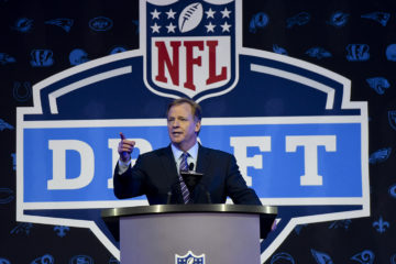 NFL Commissioner Roger Goodell opens up the 2016 NFL football draft at Selection Square in Grant Park, Thursday, April 28, 2016, in Chicago. (AP Photo/Matt Marton) Напомним, по окончании регулярного сезона НФЛ был определен порядок выбора для первых 20 команд, не попавших в плей-офф. После уайлд-кард раунда к ним присоединились формально еще 4 команды, хотя фактически – три.