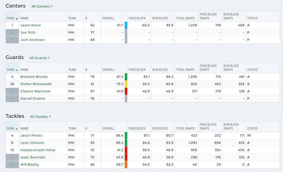 Линия выглядела хорошо на бумаге до сезона, но эту оценку давали авансом, а преображение Джейсона Келси было невероятным. После худшего сезона за последние пять лет, он не просто вернулся на прежний высокий уровень, а сыграл выше него, проведя лучший в карьере год в центре линии. Его оценка блока выноса была особенно феноменальна – 97,9 – она была не просто самой высокой оценкой за блок выноса среди центров, она была лучшей среди всех позиций в этом году. Она даже была выше оценки Эвана Матиса в 2013 году, став лучшей за 12 сезонов наших оценок.