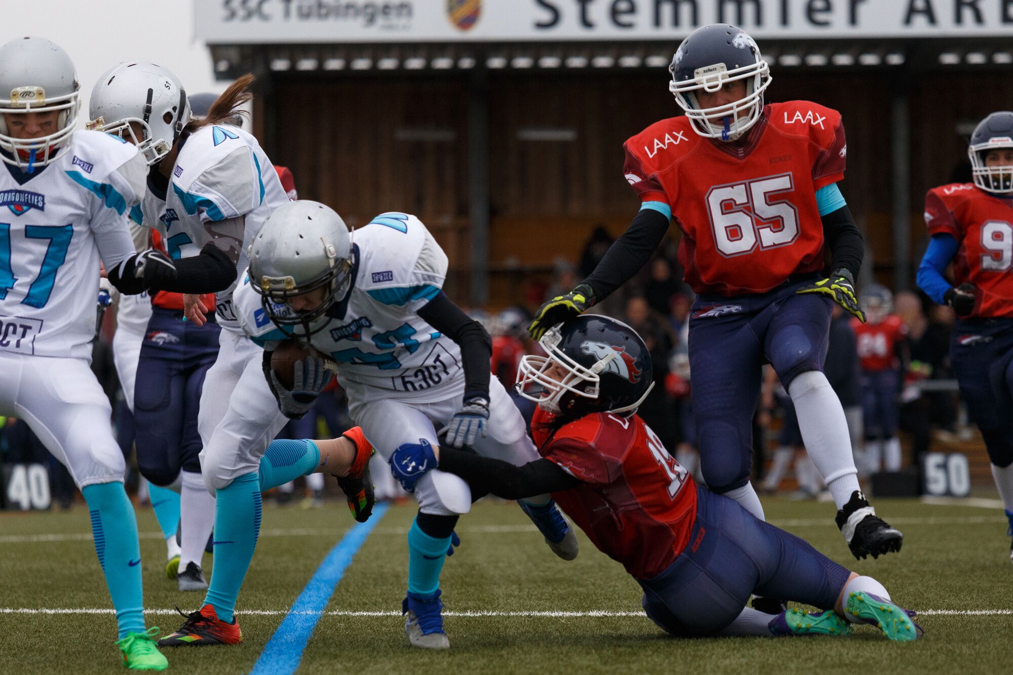 Около каждого города или городка в Германии существуют спортивные комплексы, куда входит одно или чаще несколько полей, теннисные корты, раздевалки, душевые, хранилища для инвентаря и прочие удобства цивилизации. В нашем случае комплекс, кроме прочего, включал поле для американского футбола с воротами и небольшими трибунами. В здании у поля нам показали раздевалки, душевые, предоставили место для хранения нашей экипировки. Собрались все в большой комнате для митингов, со столами по периметру и большими окнами в пол. Мы тут же представили, как комфортно в таком месте немецким командам проводить футбольную теорию или, например, разбирать ошибки прошедших игр. Вместе с командой нас встретил огромный пес Спайк в шарфе в цвет клуба. Атмосфера была очень дружелюбной и теплой, все познакомились, всем дали слово, тренера и игроки представились и обменялись добрыми пожеланиями по поводу грядущих футбольных выходных.