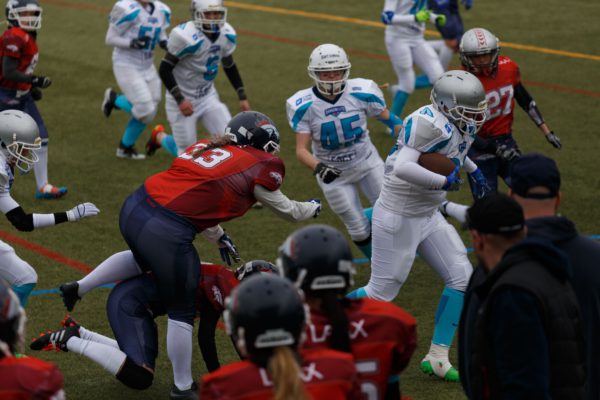 Отдельно хочу упомянуть, что в наших защите и нападении было по одному приглашенному игроку из других команд. На позиции тайт-энда играла Маша Витхина из московских «Вишен», а ди-лайн пополнила Таня Лесных из воронежских «Могучих Уток». Мы пригласили двух замечательных игроков и, как оказалось, просто отличных девчонок. С удовольствием будем приглашать девочек снова, на выезды или любые возможные футбольные мероприятия, которые запланированы на текущий сезон. К сожалению, Маша получила травму и не смогла играть во второй день, а Таня, будучи сильным игроком защиты, оказалась способна играть и на позиции тайт-энда вместо Маши, чем вдвойне покорила нас.