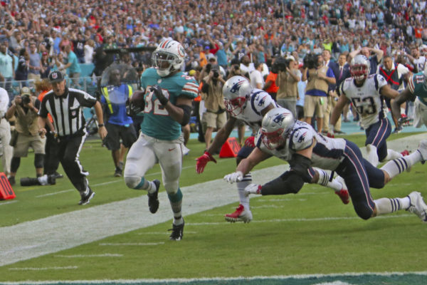 Miami Dolphins running back Kenyan Drake (32) runs for a touchdown during the second half of an NFL football game against the New England Patriots, Sunday, Dec. 9, 2018, in Miami Gardens, Fla. The Dolphins defeated the Patriots 34-33. (David Santiago/Miami Herald via AP) ORG XMIT: FLMIH201