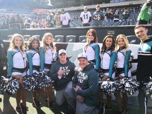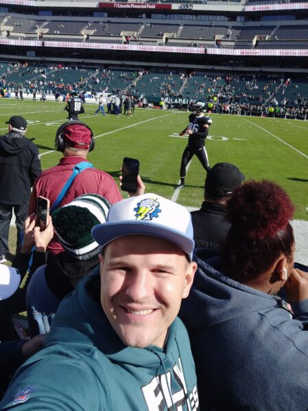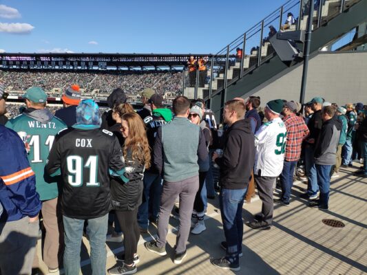 Утро воскресенья началось с того, что вся Филадельфия перекрасилась в зеленый цвет! Мы поехали на игру пораньше (как думали), потому как у нас были проходки на сайдлайн во время разминки команд. Но выйдя из метро (которое к слову больше похоже на хоспис, т.к. количество бомжей в нем просто не поддается подсчету), мы испустили протяжные возгласы наподобие «ни х… себе, т.е. у-а-а-аа-уу!» увидев количество людей на парковках. В 9:40 утра тейлгейт был уже в полном разгаре и все вокруг было заполнено различными вариациями гриля и атрибутикой «Иглс». Атмосфера не передается словами – как будто ты сидишь в шлюпке во время крушения «Титаника».