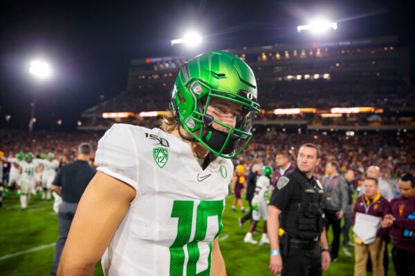 Oregon quarterback Justin Herbert walks off the field after a loss to Arizona State that essentially kills the Ducks' shot at a Playoff spot. Photo: MARK J. REBILAS, USA TODAY SPORTS