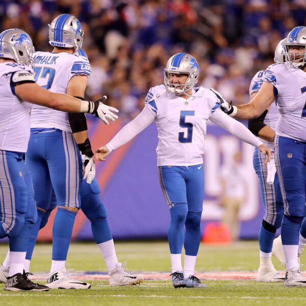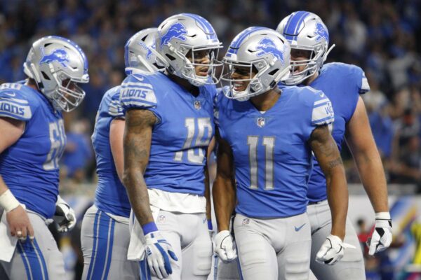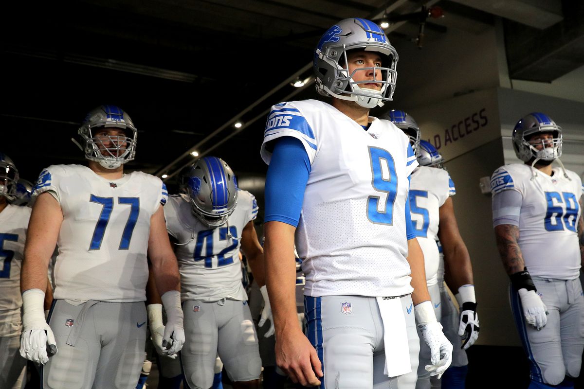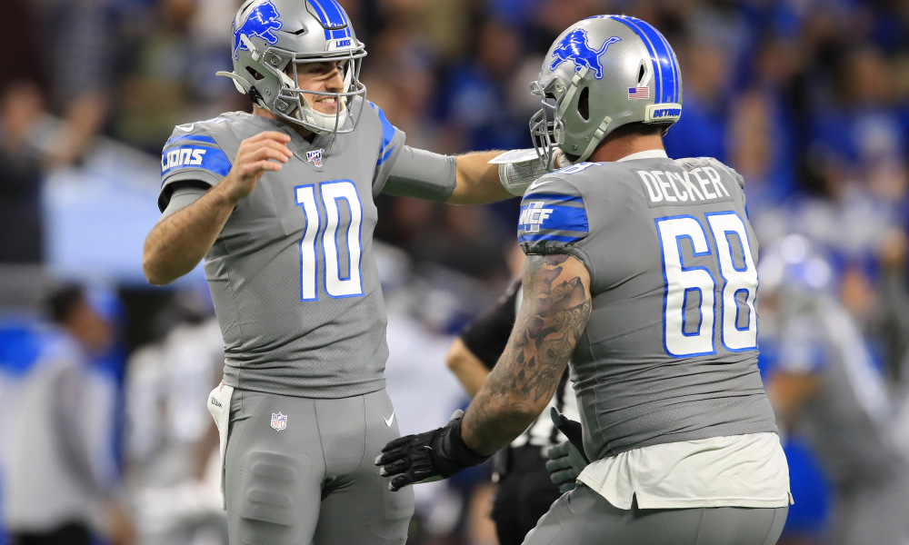 DETROIT, MICHIGAN — NOVEMBER 28: David Blough #10 of the Detroit Lions celebrates his first half touchdown pass with Taylor Decker #68 of the Detroit Lions while playing the Chicago Bears at Ford Field on November 28, 2019 in Detroit, Michigan. (Photo by Gregory Shamus/Getty Images)