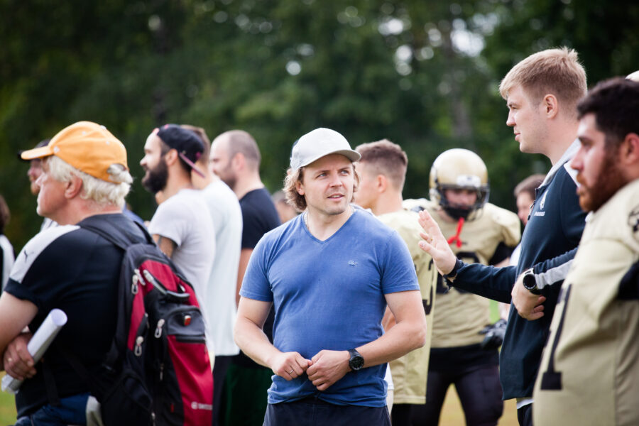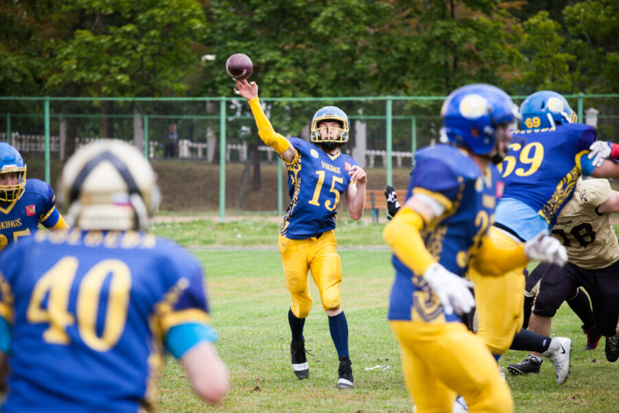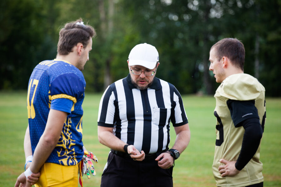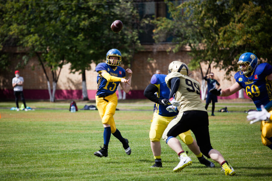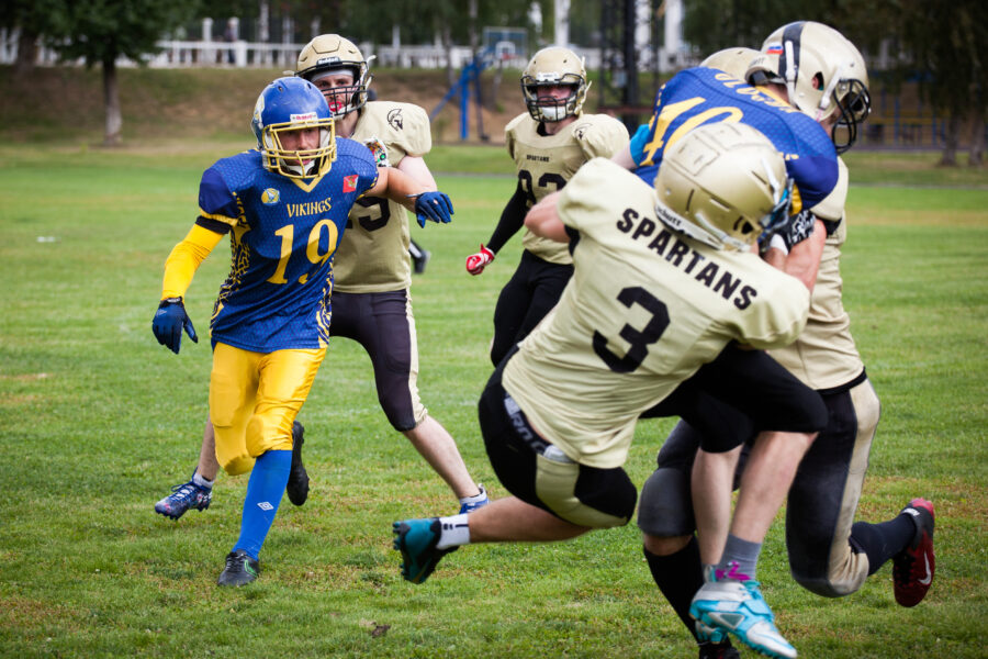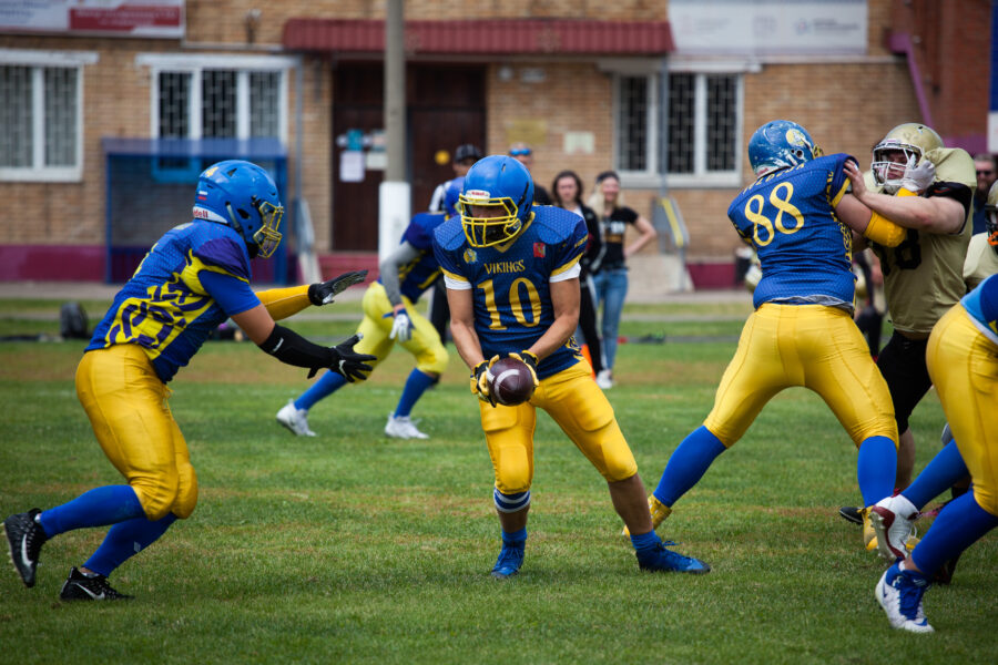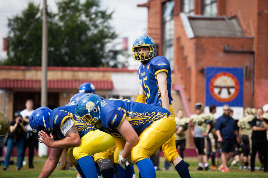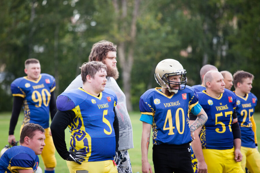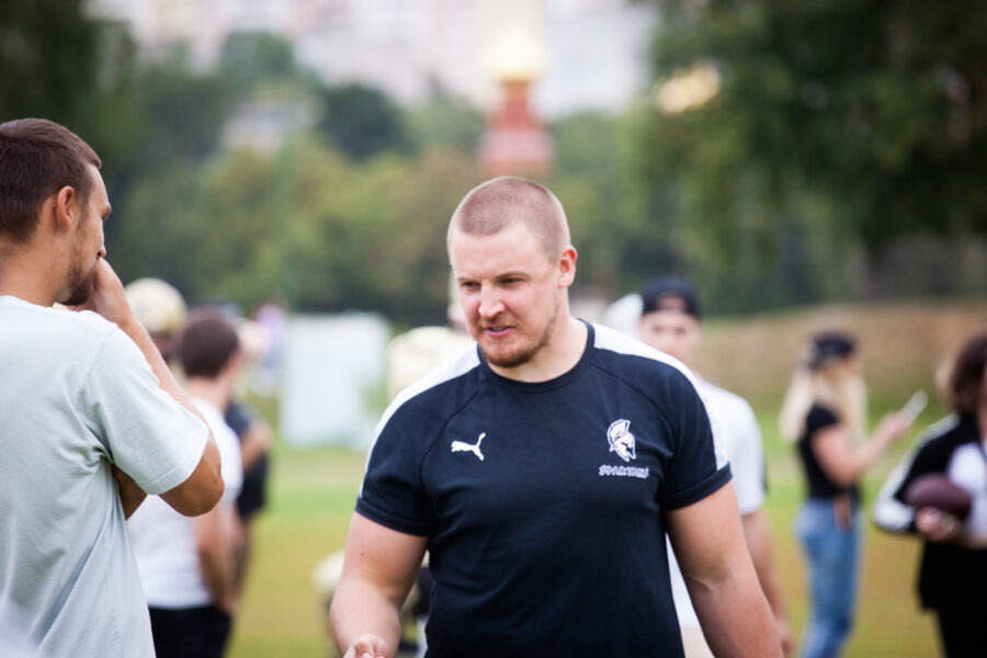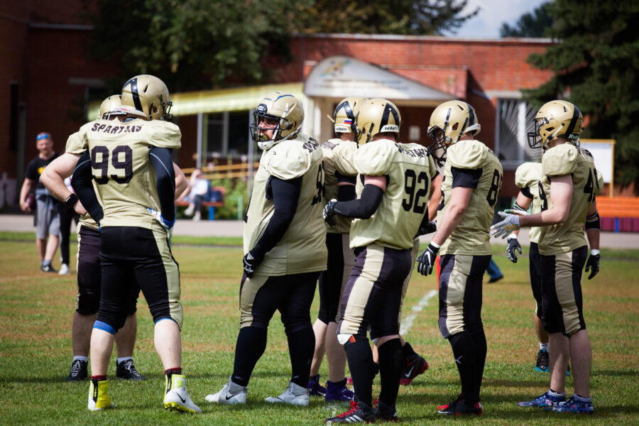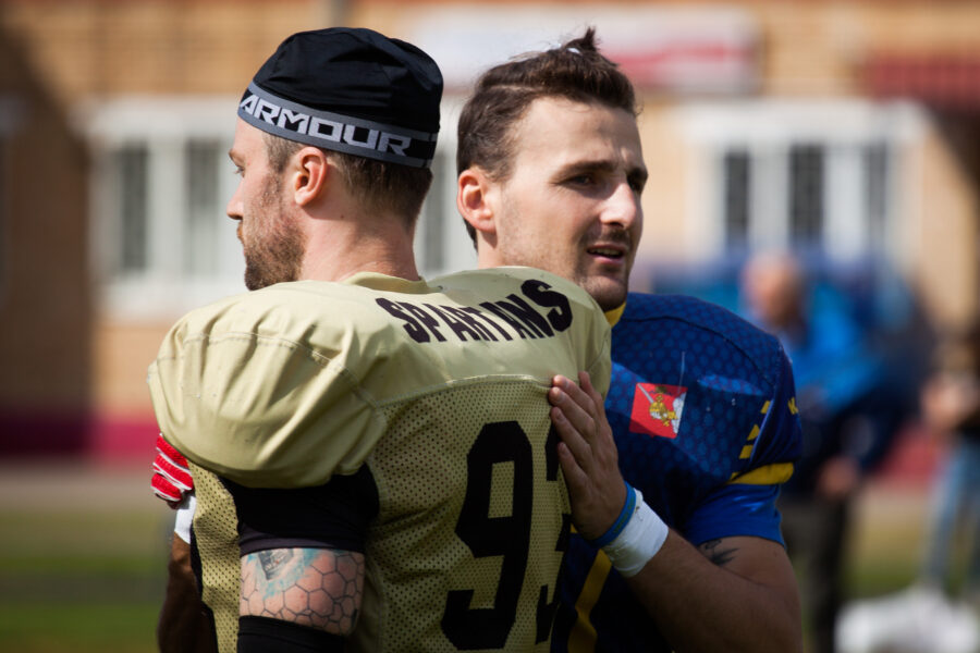 - Никита Шемякин, Владимир Платонов и Кирилл Святкин перед матчем 2-го тура Первой лиги чемпионата России между московскими «Спартанцами-2» и вологодскими «Викингами». 16 августа 2020 г., Дзержинский, Московская обл., Россия. Фото: Юрий Марин (First & Goal)